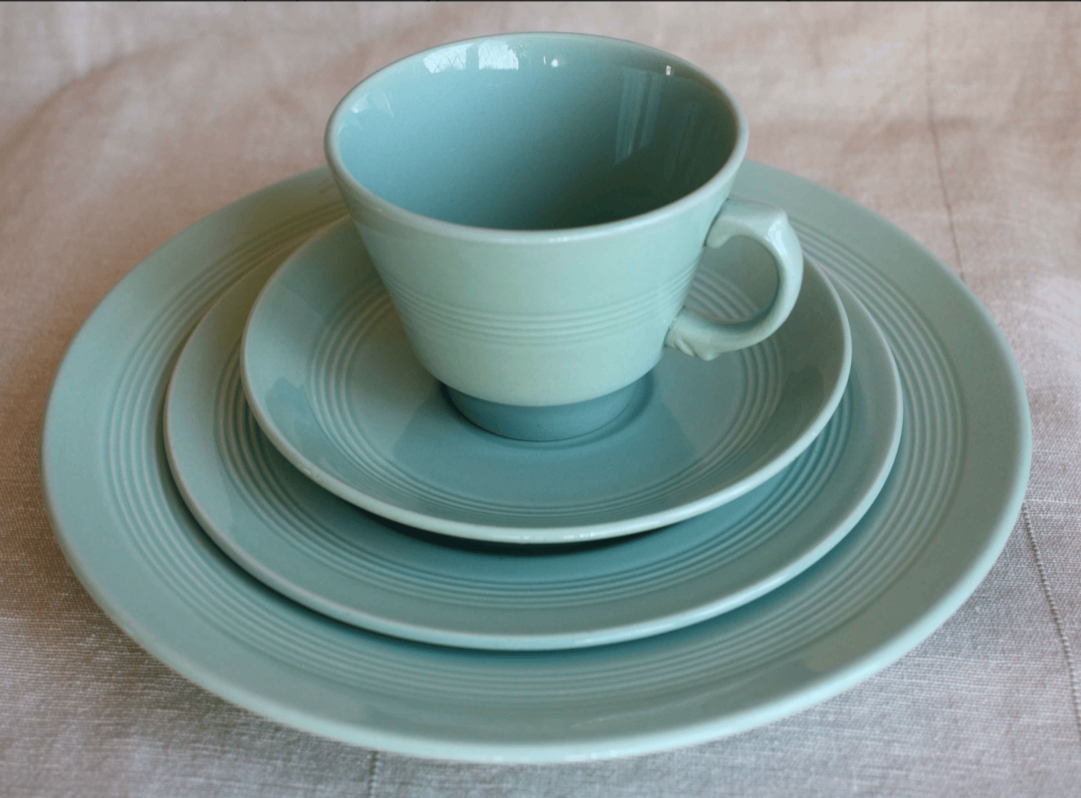 Manufactured by Stoke-On-Trent pottery Wood & Sons from 1940 onwards, it comes in three pretty pastel colours: ‘Iris’ blue, ‘Jasmine’ yellow and ‘Beryl’ green – the most common colour and the type I collect.